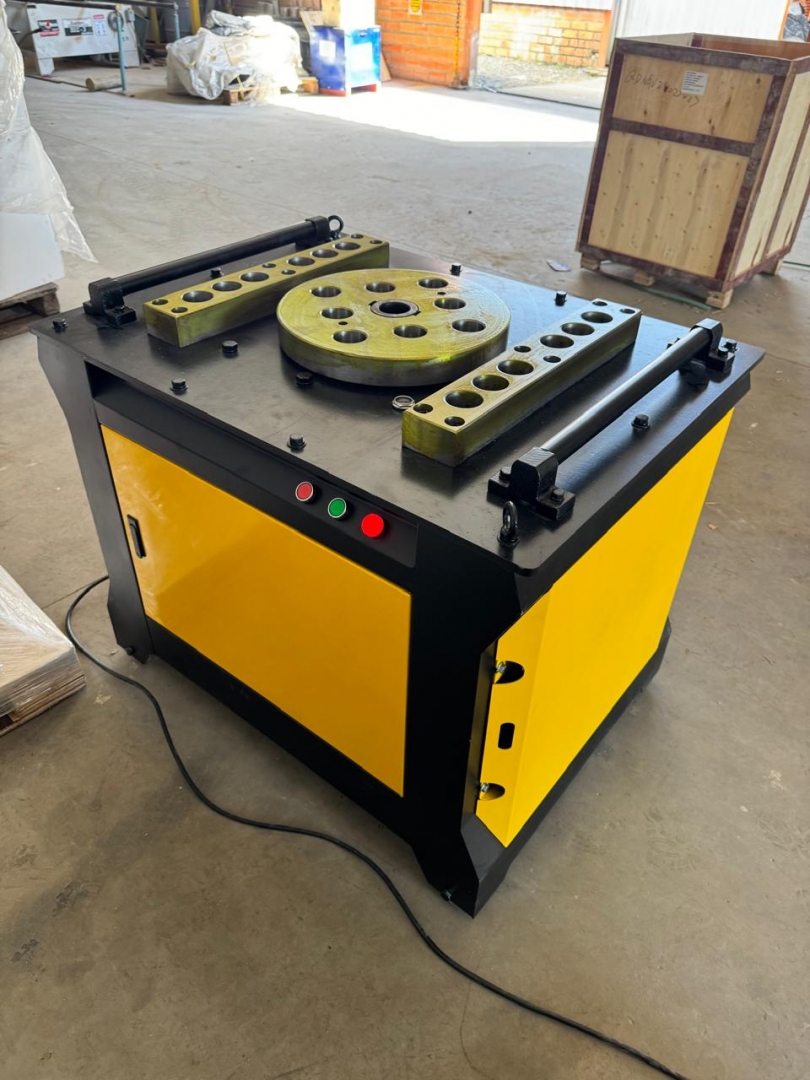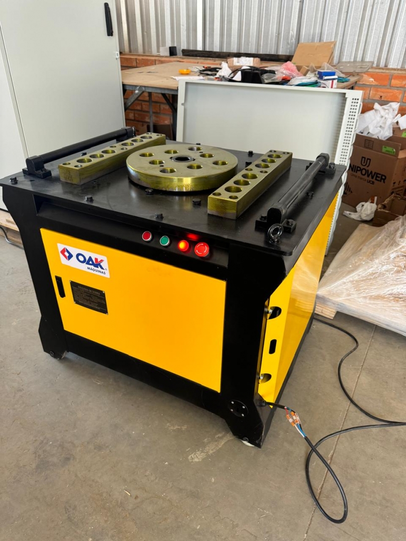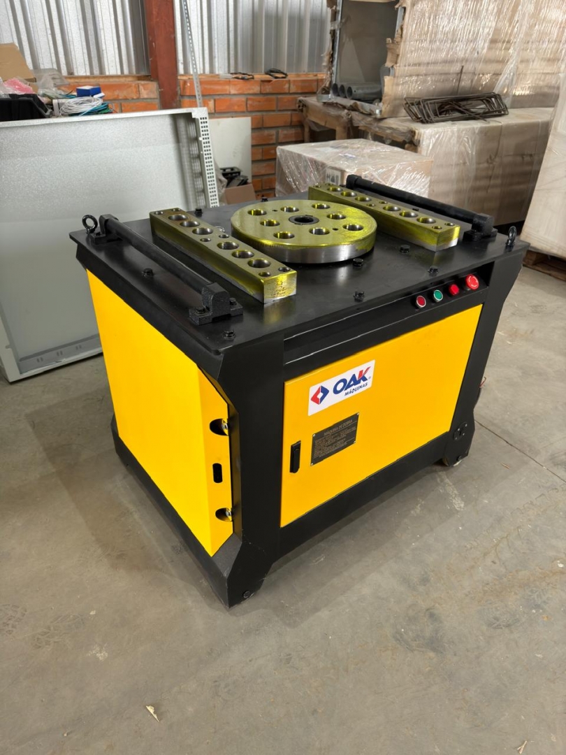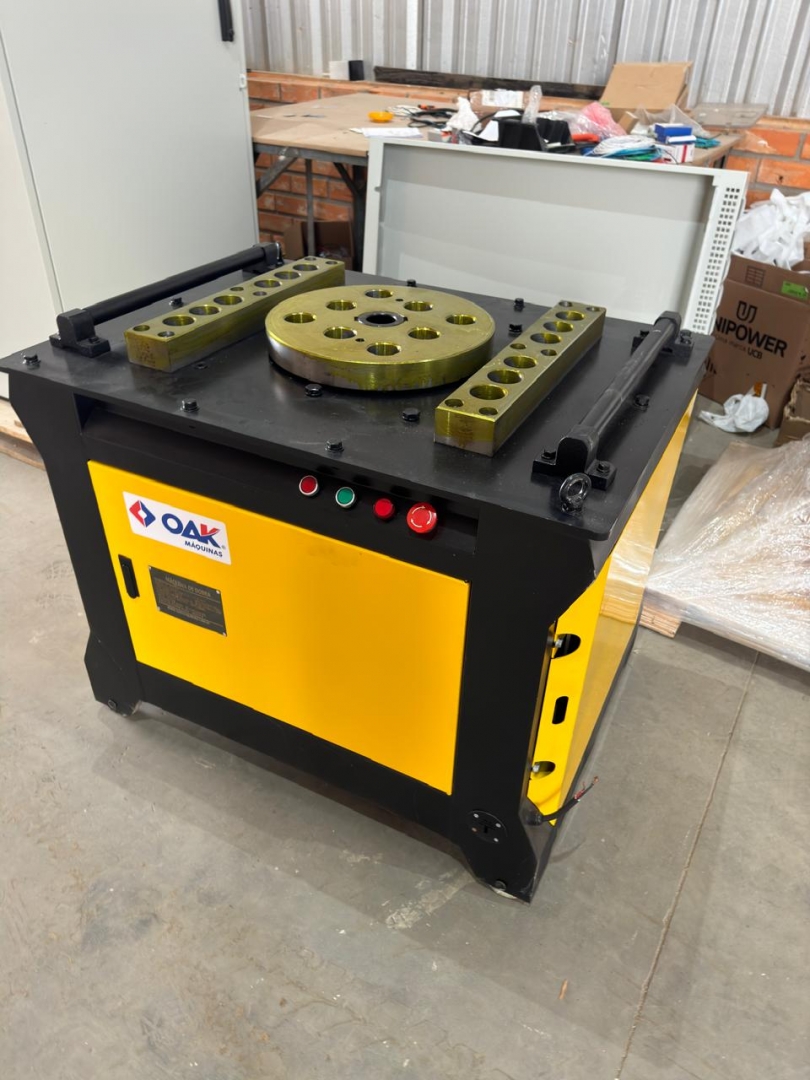 Esta é uma máquina de dobrar vergalhões de aço, modelos GW50+, projetada para curvar barras de reforço de grandes diâmetros com alta eficiência e precisão. Com uma construção extremamente robusta em cinza e amarelo, esta máquina é ideal para trabalhos pesados e contínuos em canteiros de obras. Possui um painel de controle avançado para ajustes finos e operação, e sua estrutura é reforçada com uma espessura de painel de 12mm, garantindo durabilidade e estabilidade. Os rodízios amarelos indicam que, apesar do peso considerável, a movimentação é possível no local de trabalho.