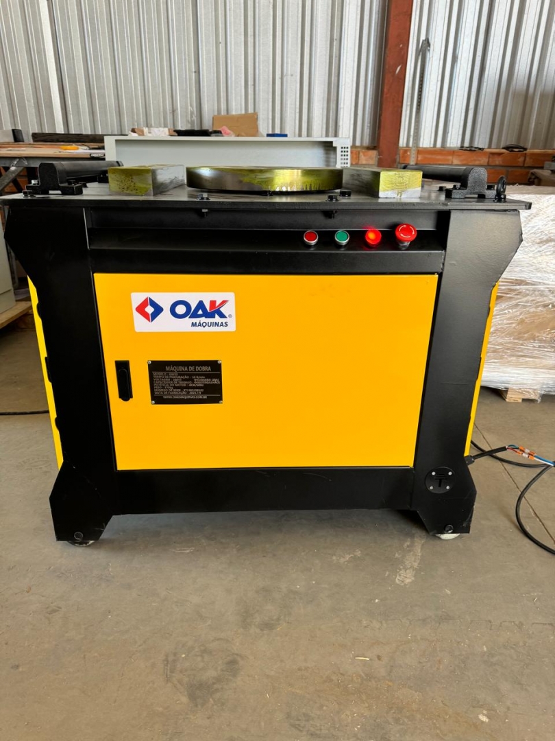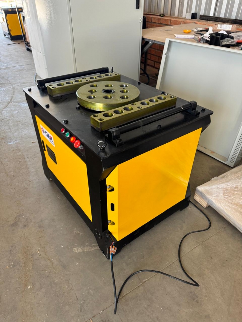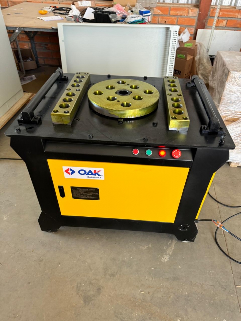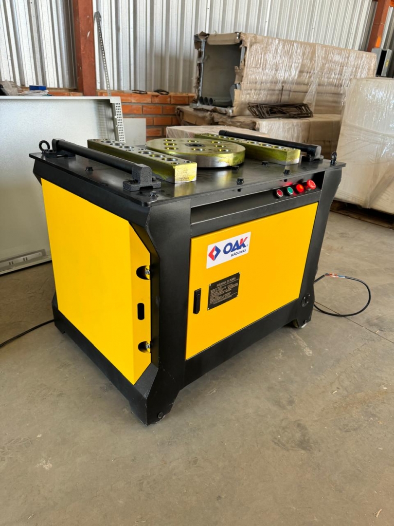 Esta é uma máquina de dobrar vergalhões de aço, modelos GW50+, projetada para curvar barras de reforço de grandes diâmetros com alta eficiência e precisão. Com uma construção extremamente robusta em cinza e amarelo, esta máquina é ideal para trabalhos pesados e contínuos em canteiros de obras. Possui um painel de controle avançado para ajustes finos e operação, e sua estrutura é reforçada com uma espessura de painel de 12mm, garantindo durabilidade e estabilidade. Os rodízios amarelos indicam que, apesar do peso considerável, a movimentação é possível no local de trabalho.