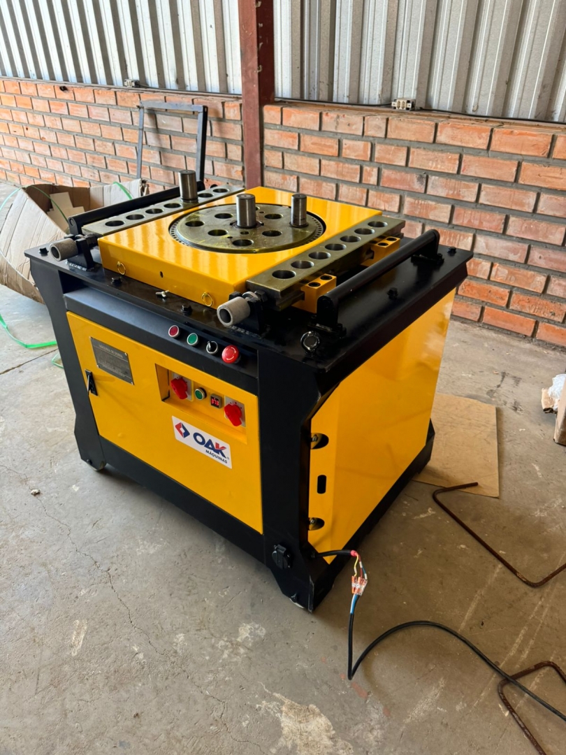 Esta é uma máquina de dobrar vergalhões de aço, modelo GW52, classificada como semiautomática, ideal para curvar barras de reforço de grandes diâmetros com alta precisão e controle. Com uma construção robusta em cinza e amarelo, a máquina é projetada para durabilidade e uso intensivo em canteiros de obras. Ela se destaca por sua operação semiautomática, que pode incluir um pedal para acionamento, oferecendo maior controle ao operador. O painel de controle intuitivo, a espessura do painel de 12mm e a potente caixa de engrenagens (gearbox) reforçam sua capacidade para trabalhos pesados.