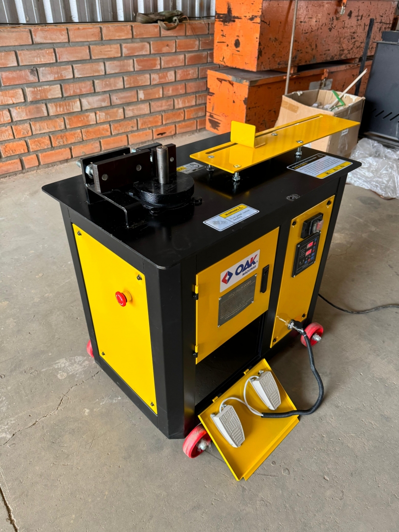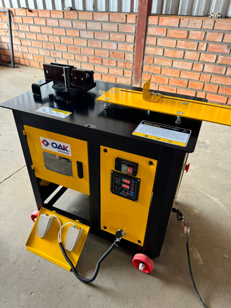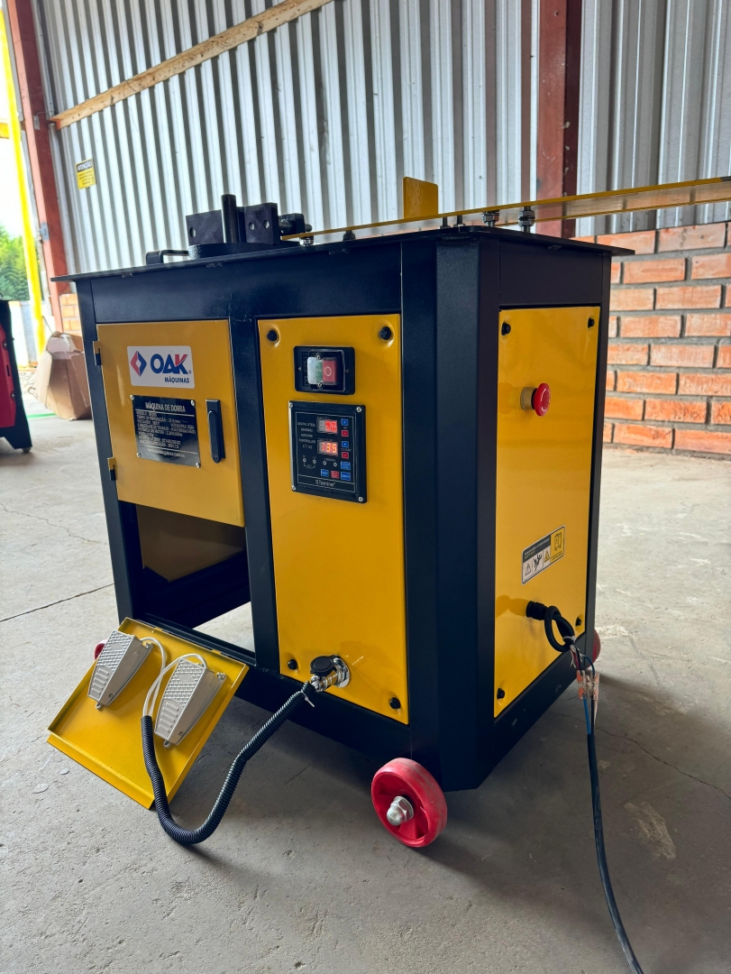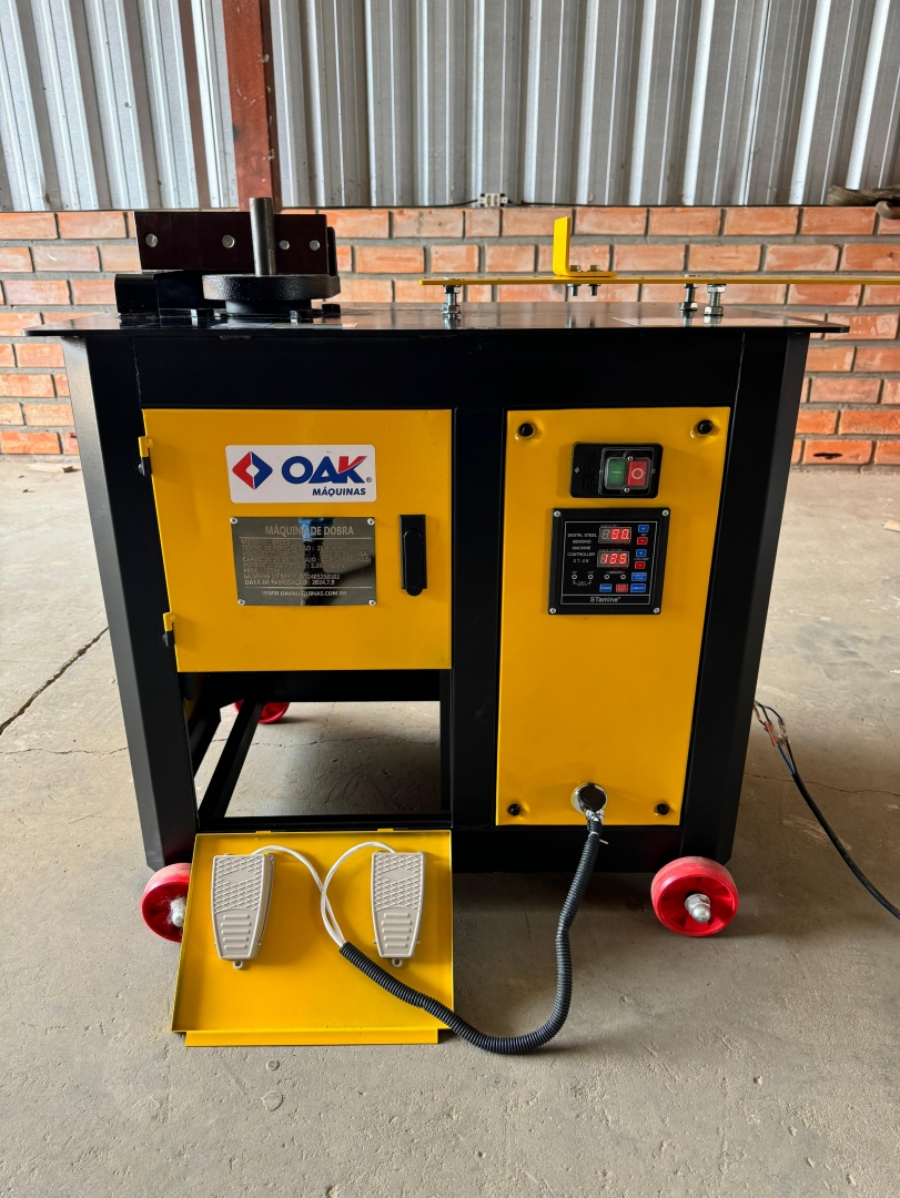 Esta é uma máquina de dobrar vergalhões de aço, modelo GF20, projetada para curvar barras de reforço em diferentes formatos e ângulos. Com sua estrutura robusta e rodízios, a máquina é portátil e fácil de manobrar em canteiros de obras. O design em amarelo e preto garante boa visibilidade e durabilidade. Ela possui um painel de controle intuitivo para operação e ajuste dos parâmetros de dobra.
